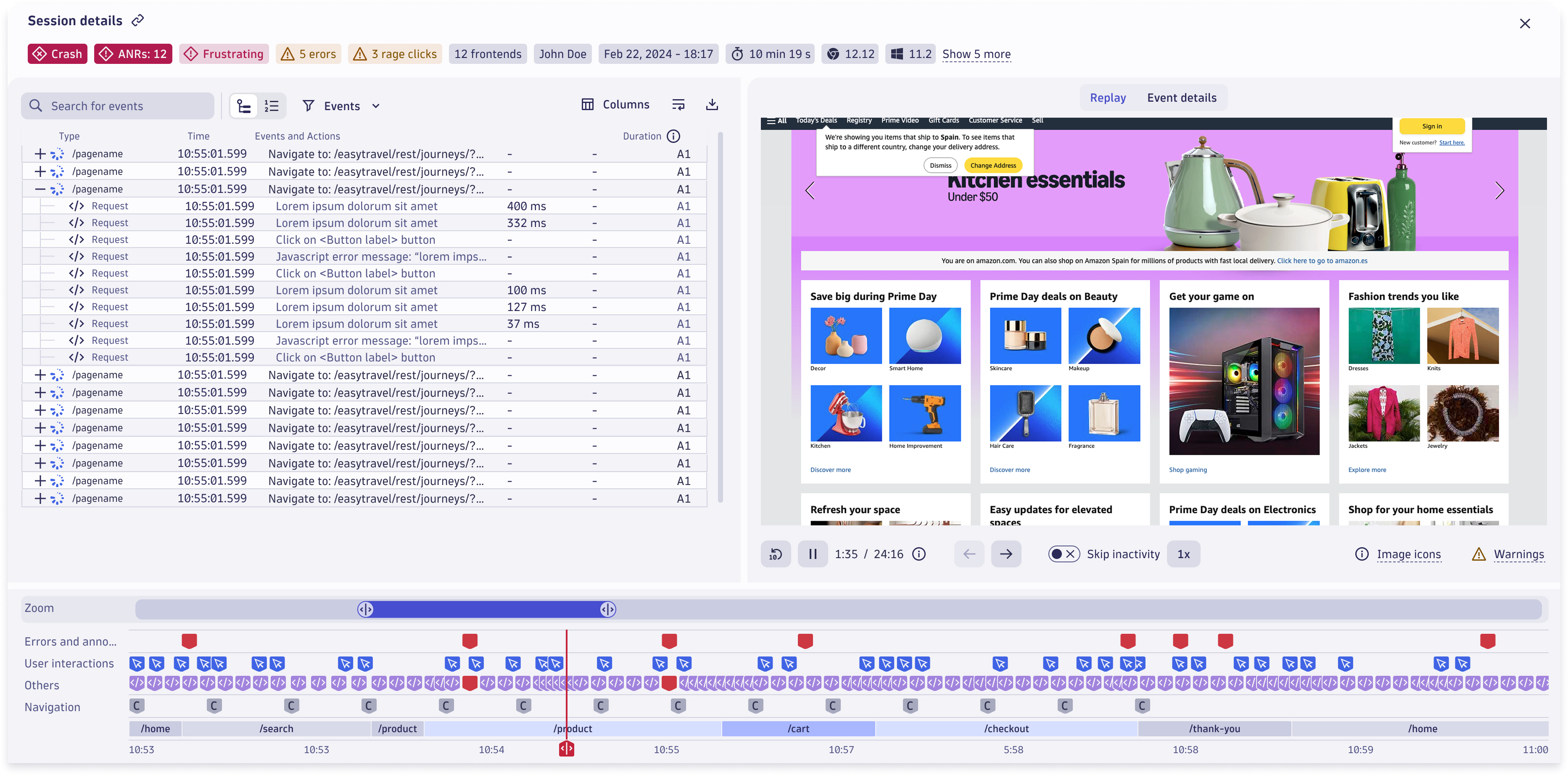 See exactly what your users see with video-like recordings of every user session.