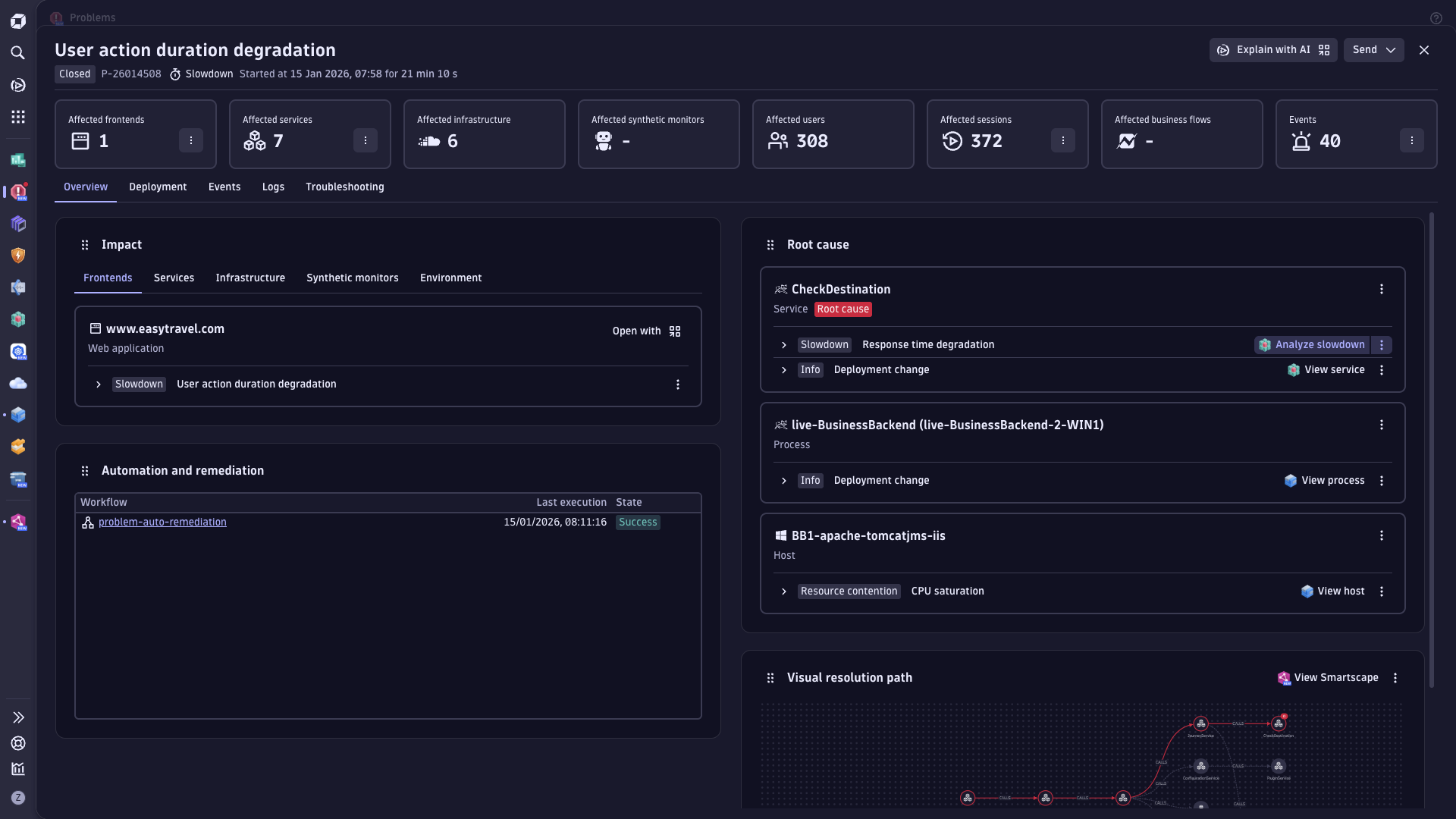 Dynatrace Intelligence continuously monitors your infrastructure, cloud platforms, and hosts to help reduce major outages and degradations by up to 60%, and mean time to recovery (MTTR) by 90%.